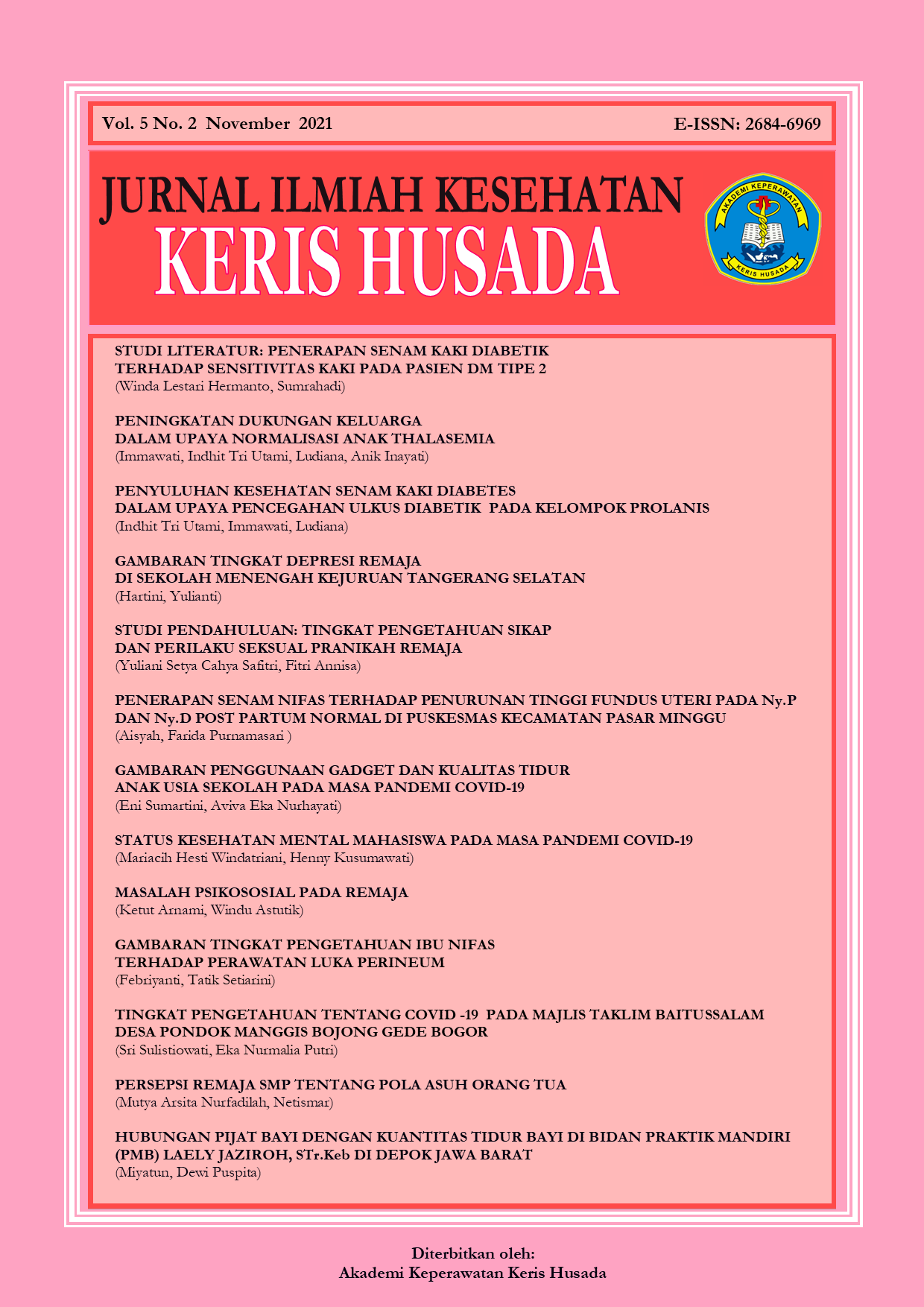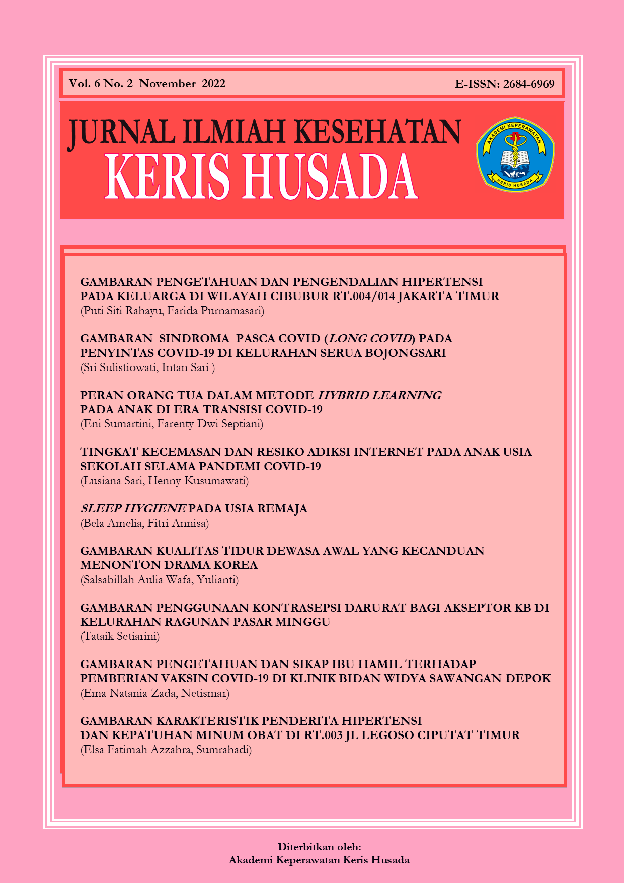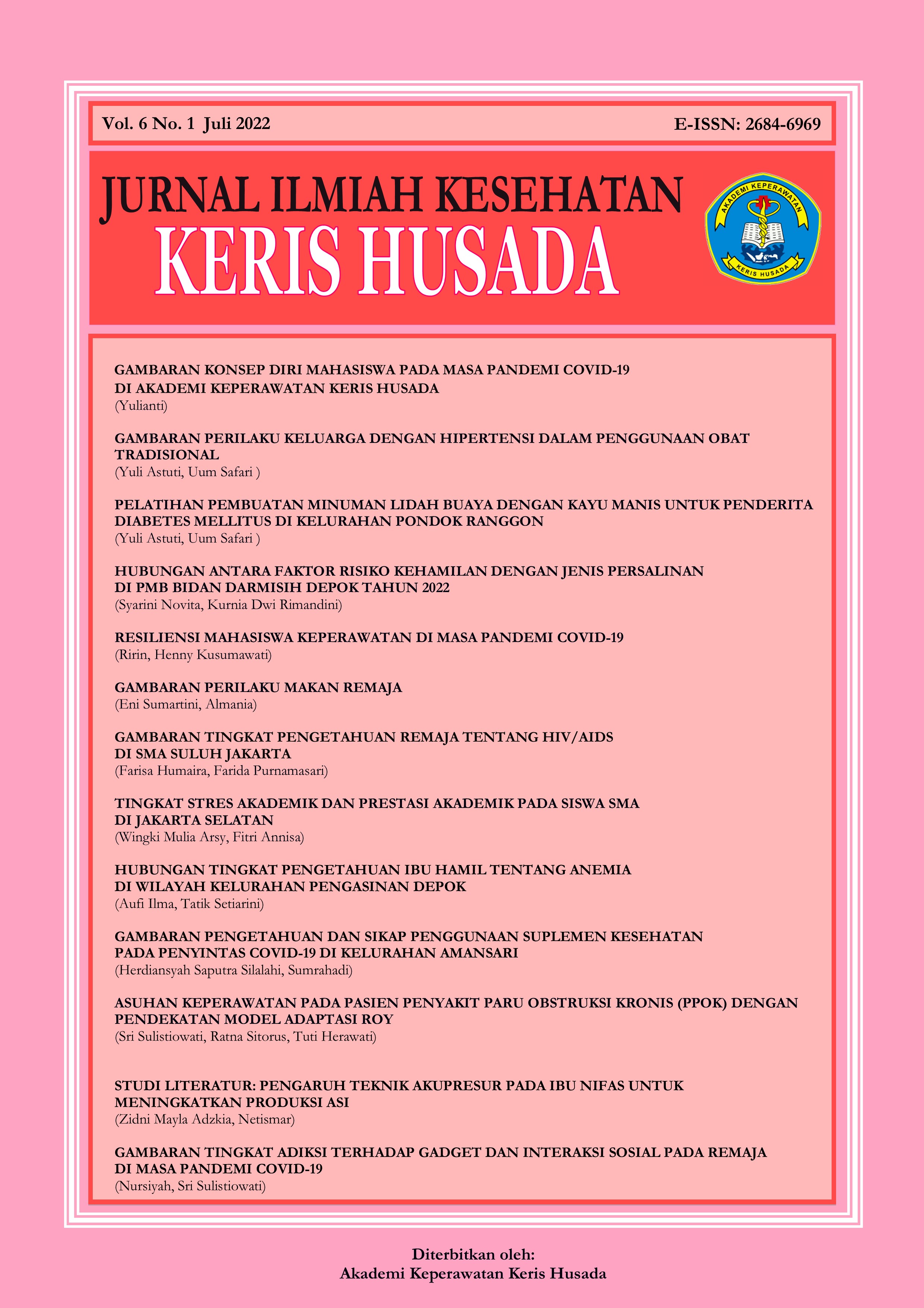 Vol 6 No 02 (2022)Syukur Alhamdulillah, kami panjatkan puji dan syukur kepada Allah SWT karena kami dapat menerbitkan Jurnal Ilmiah Kesehatan Keris Husada volume keenam nomor dua untuk ikut meramaikan khasanah keilmuan, khususnya di bidang keperawatan, kesehatan masyarakat dan kebidanan. Tim redaksi berterimakasih kepada seluruh pihak yang telah membantu dan berkontribusi, sehingga kami dapat melanjutkan menerbitkan jurnal ini.