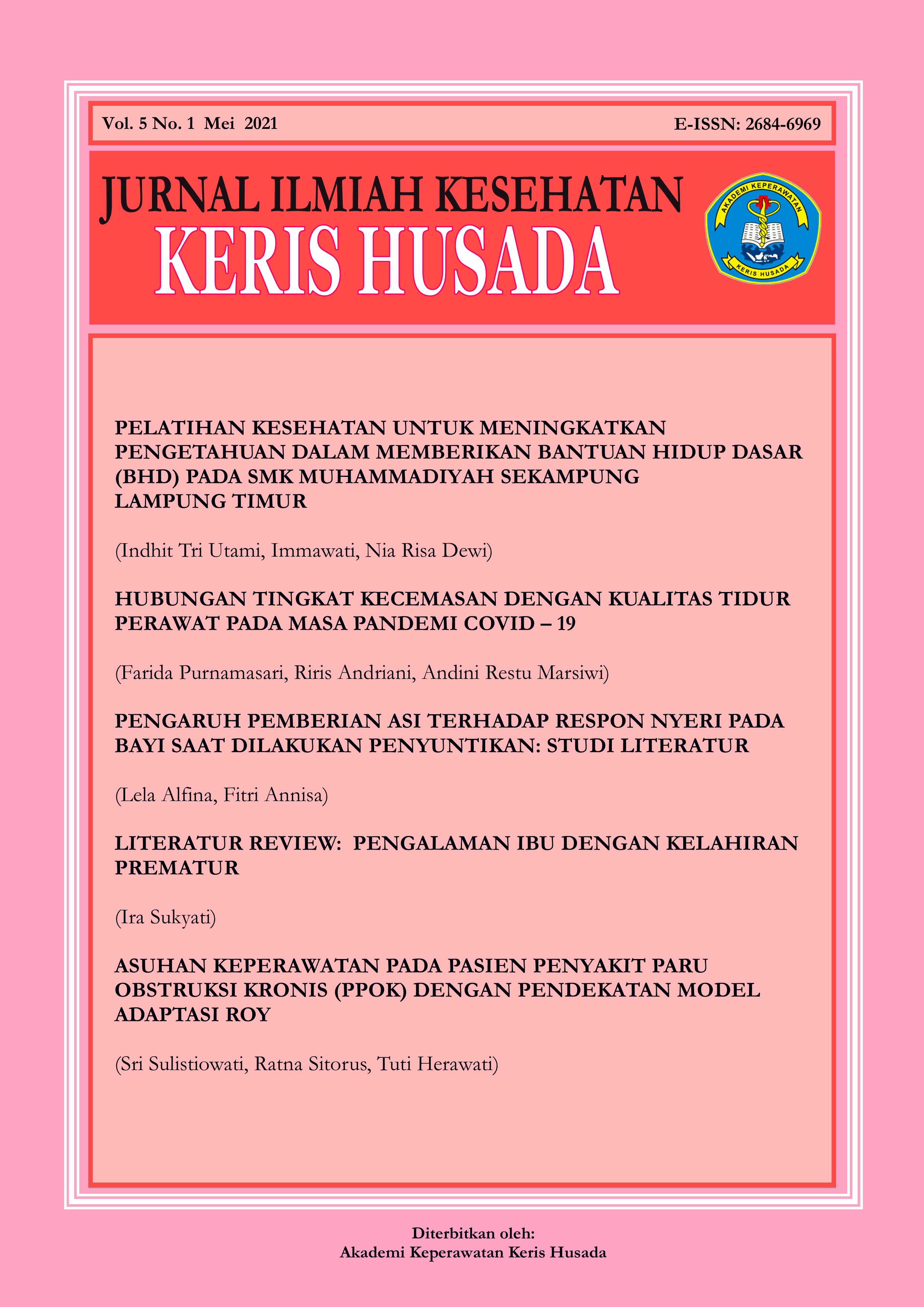 Vol 5 No 02 (2021)Syukur Alhamdulillah, kami panjatkan puji dan syukur kepada Allah SWT karena kami dapat menerbitkan Jurnal Ilmiah Kesehatan Keris Husada volume kedua untuk ikut meramaikan khasanah keilmuan, khususnya di bidang keperawatan, kesehatan masyarakat dan kebidanan. Tim redaksi berterimakasih kepada seluruh pihak yang telah membantu dan berkontribusi, sehingga kami dapat melanjutkan menerbitkan jurnal ini.